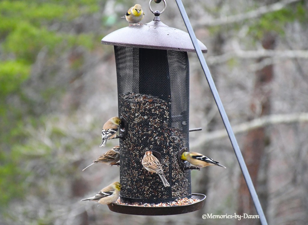 Jan 21 Breakfast The Gold finches have returned to our feeder. In case you are wondering, the bird feeder is crooked as the squirrels were some how able to unscrew the lid and it fell from deck. 21/365. Share this: Click to share on Pinterest (Opens in new window) Pinterest Click to share on Facebook (Opens in new window) Facebook Like Loading... Related