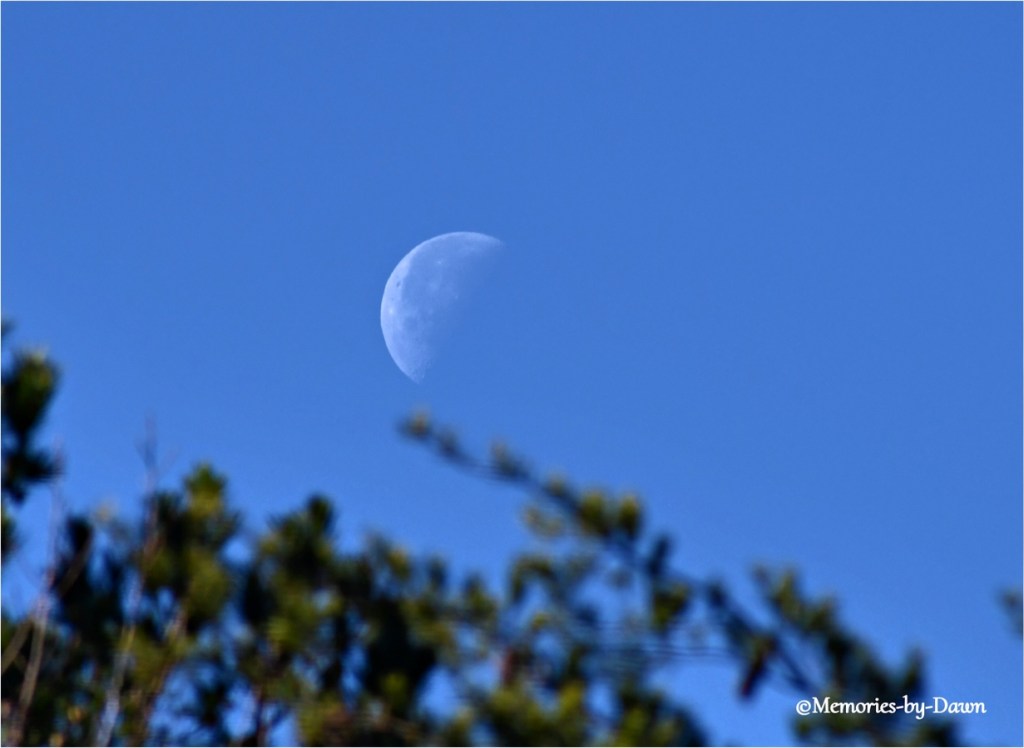 Feb 13 Half moon I was taking pictures of the birds on our feeders when I looked up and saw this moon peeking over the tree tops. It wasn’t there long, and I’m happy I was able to get this shot of it. 44/365. Share this: Click to share on Pinterest (Opens in new window) Pinterest Click to share on Facebook (Opens in new window) Facebook Like Loading... Related