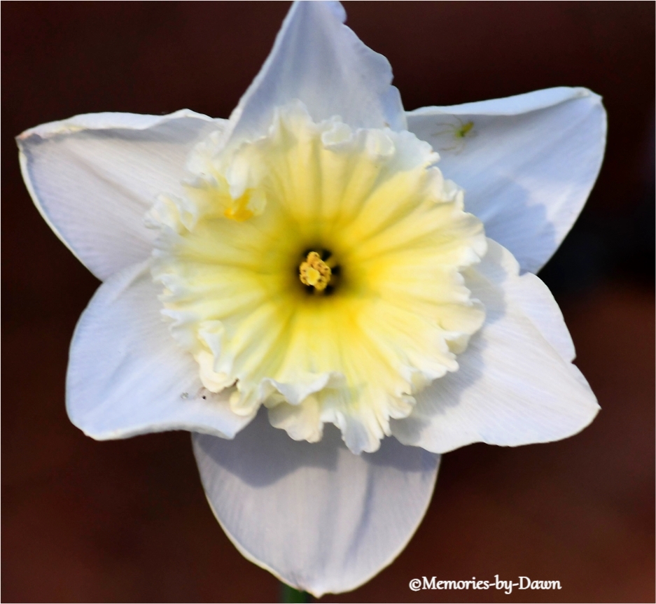 I was photographing daffodils again (nothing else has bloomed yet..LOL), I was messing around with my manual settings, and not doing very well. When I downloaded the pictures, I saw this photo. I noticed the little spider on the right bloom. I cropped the picture. He’s blurry, but I think it is cool that I caught him. Would have like to have seen him earlier so I could focus on him. 59/365.