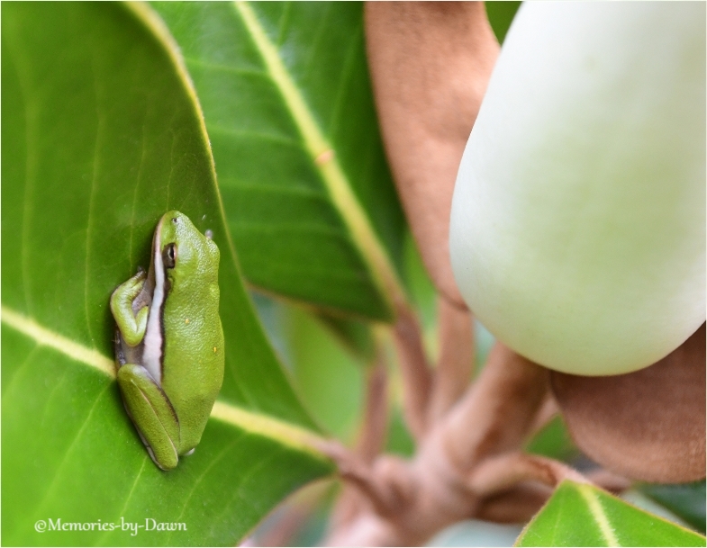 Oct 20 Green Tree Frog-2 Here is the first picture when I saw this adorable tree frog. 293/365. Share this: Share on Pinterest (Opens in new window) Pinterest Share on Facebook (Opens in new window) Facebook Like Loading... Related