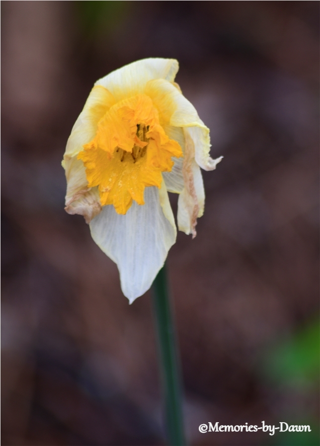 I was photographing daffodils again (nothing else has bloomed yet..LOL), I was messing around with my manual settings, and not doing very well. When I downloaded the pictures, I saw this photo. I noticed the little spider on the right bloom. I cropped the picture. He’s blurry, but I think it is cool that I caught him. Would have like to have seen him earlier so I could focus on him. 59/365.